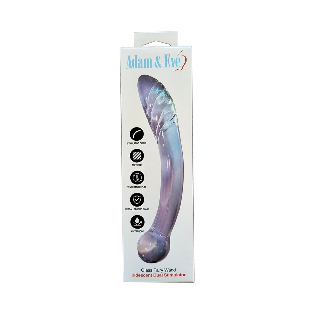 This iridescent dual stimulator is called the Fairy Wand for a great reason. As the dildo works your erogenous zones you'll cast a spell of pure pleasure over every nerve. Each tip offers different sensations. The rounded tip makes you feel oh-so-full! The curved end has ridged texture and a curved tip for sweet stimulation that will send your O's soaring. Play vaginally or anally! The hypoallergenic body-safe glass is gentle on your body but ultra-durable. Glass toys can last a lifetime with proper care. This wand can even withstand cooling and warming for extra-sensational temperature play. Waterproof. Velvet storage pouch included. 8.75 by 1.25 inches. 7 inches insertable.