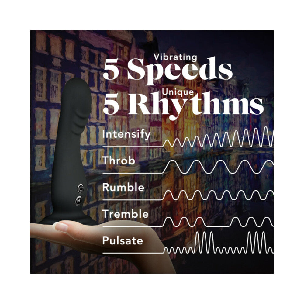 The Impressions Amsterdam is ready to deliver fun all year long! The sleek curves of Amsterdam match your anatomical pleasure points and the ribbed head provides additional powerful sensations to your play. With powerful vibrations that cycle through 5 levels and 5 variations of pulsation and escalation using the RumbleTechô motor Amsterdam is ready to take you on the ultimate adventure. The flared base makes it harness compatible and safe for anal play. The powerful suction cup allows you to play hands free; just stick it to any smooth flat surface. Amsterdam is USB magnetic rechargeable (to ensure it remains waterproof for the lifetime of the product) and IPX7 waterproof for easy cleaning. Ultrasilkô smooth and made with Puriaô platinum-cured silicone itís body safe and phthalate free. With Impressions the possibilities are endless so pack up and get ready to go to Amsterdam!- 6.75 Inch Length (5.75 Inch Insertable) x 1.5 Inch Width