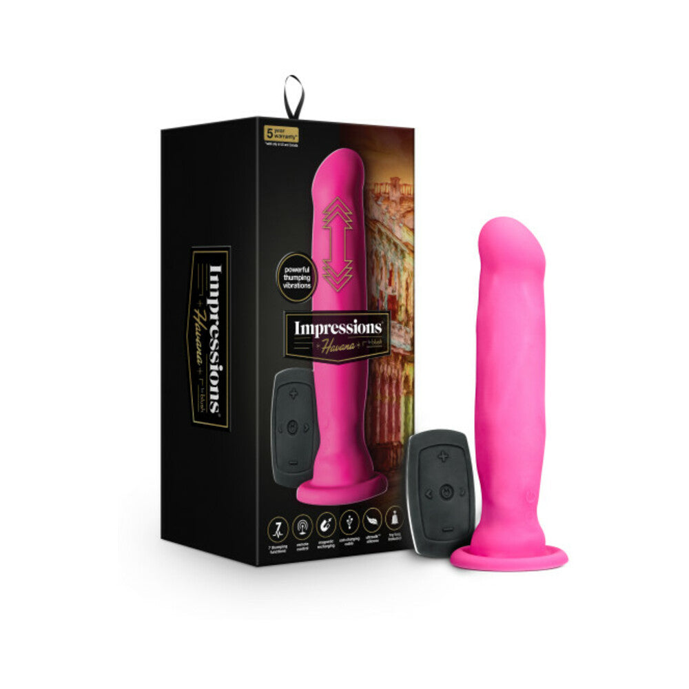 The Impressions Havana is prepared for an adventure! Havana has a powerful thumping motor that rocks the toy inside you for unparalleled pleasure. With a thumping function that cycles through 3 speed levels and 4 variations of pulsation and escalation Havana is ready to delight all night long. Itís ready to explore wherever you desire and rocking can be controlled through the toy or the included wireless remote control. The flared base makes it harness compatible and safe for anal play. The powerful suction cup allows you to play hands free; just stick it to any smooth flat surface. Havana is USB magnetic rechargeable (to ensure it remains waterproof for the life of the product) and IPX7 waterproof for easy cleaning. Ultrasilkô smooth and made with Puriaô silicone itís body safe and phthalate free. With Impressions the possibilities are endless so pack up and get ready to enjoy Havana!- 8-Inch Length (6.5-Inch Insertable) x 1.75-Inch Width