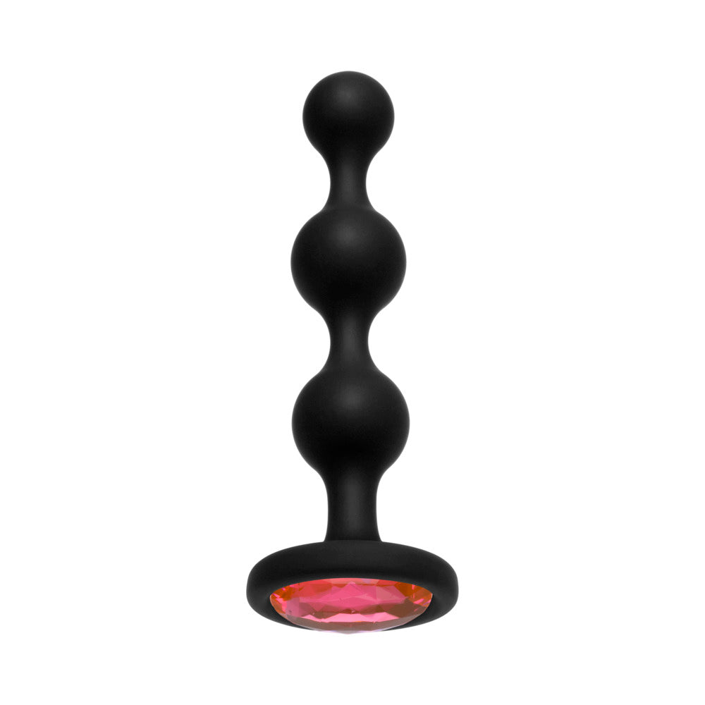 Three moderately sized anal beads made of premium health-grade silicone allow for comfortable extended wear. A shiny purple gem contrasts against the black safely flared base. Booty Bling is insertable up to 3.75in with a .75in diameter. Also available with Pink or Silver gem.