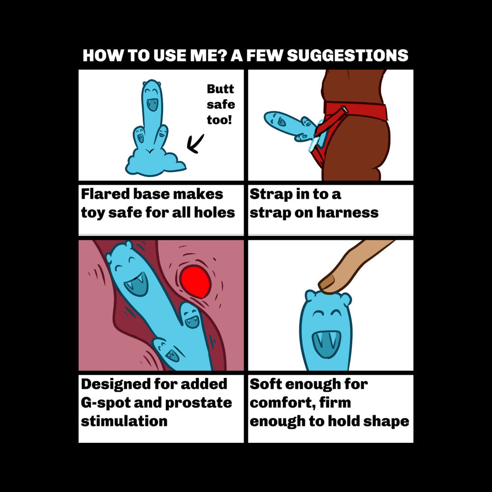 Trinity comes from a cloud planet a blue green gas giant of air so she loves feeling your breath get heavy and soft again. Her long thin nature makes her perfect for inserting into all sorts of sneaky places. When Trinity is exploring your deepest fantasies Tripp and Trine are there to stimulate some of your other extra sensitive spots. Trinity's flared base can be used to secure her in a strap-on holster particularly exciting for lesbians and transmasc humans. The flared base also means she he and xe are butt play safe. Trinity is a playful and purposeful friend.