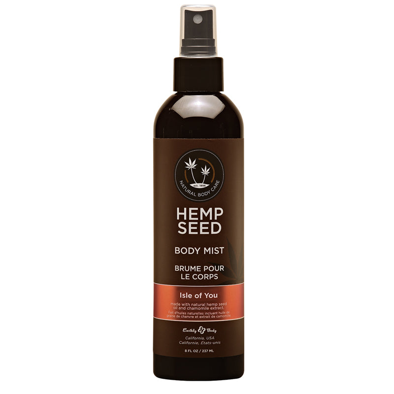 A fragrant refreshing spray that moisturizes and invigorates your skin. This light seductive spray nourishes your faces and body with hemp and pure botanicals. Use this alcohol-free mist to refresh linens and carpets a lightweight perfume or toss in the fridge for the cool blast of freshness on a hot day. Isle of You scent is a combination of coconut water citrus and vanilla. 8 oz.