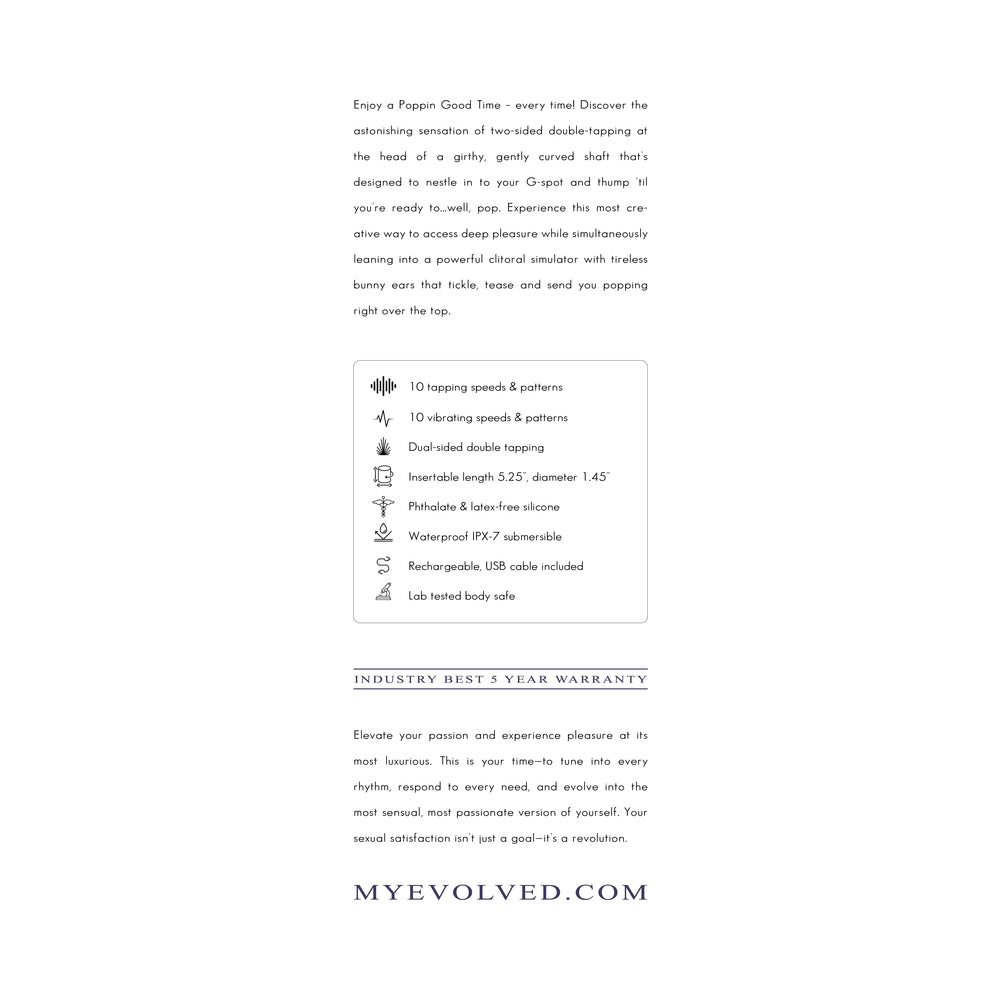 Indulge in a Poppin Good Time with this innovative G-Spot vibrator, featuring a gently curved shaft and powerful clitoral stimulation from its bunny ears. With 10 tapping speeds and a design that targets your G-spot, this vibrator promises to elevate your pleasure to new heights.