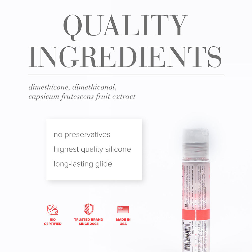 JO All-In-One Sensual Massage Glide Warm Embrace is our premium silicone-based massage formula offering a long-lasting buttery feel and a gentle warming sensation. Smooth and satisfying it dries down to a matte soft-touch finish. One drop of All-In-One Sensual Massage Glide is equal to ten drops of traditional massage oil so a little goes a long way! Perfect for everything from full body deep tissue massage to erotic teasing it can even be used as a tattoo brightener and body conditioner so seal in moisture.