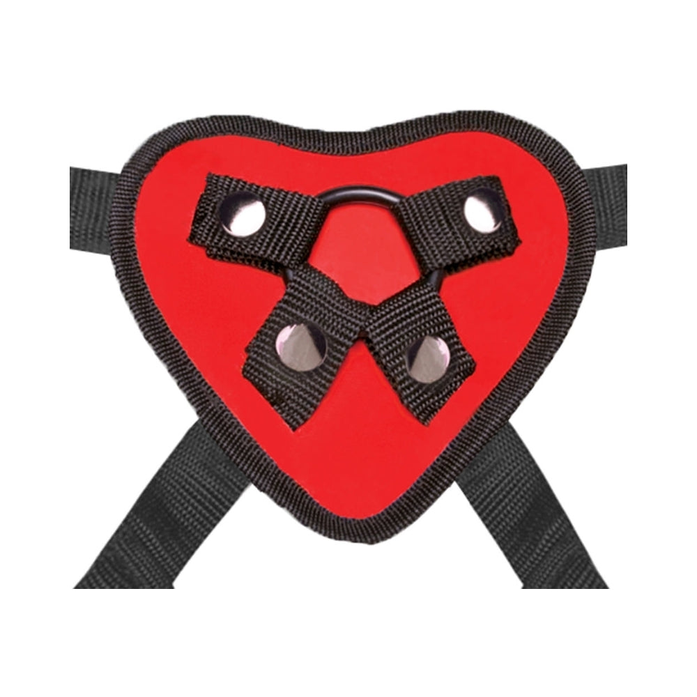 Melt hearts and erogenous zones with a red-hot heart-shaped strap-on harness and beginner-friendly dildo. Romance and multiple orgasms are in the air with the Lux Fetish Red Heart Strap On Harness and 5-Inch Dildo Set. The fully adjustable unisex harness fits waists up to 65î making it perfect for users of all sizes. The padded front panel provides comfort while bumping and grinding while the included interchangeable rings can be used when a larger-size toy is desired. 4.5 inches insertable .84 inches wide.