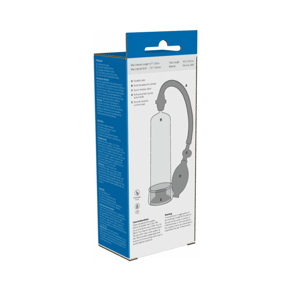 The Me You Us Pumped Up Fire penis pump gives him great gains and allows him to improve his penis size girth and health in comfort. This penis pump has a firm suction and a comfort seal that ensures it stays close to your body for a perfect fit and maximum efficiency. This penis pump has a solid transparent cylinder and a soft pneumatic pump action bulb that is easily squeezed to create suction and growth. The flexible tube that connects the hand pump to the cylinder allows for comfortable movement. The comfort seal is finished with smooth and stretchy TPE. This penis pump measures a maximum internal length of 19.5cm with a maximum internal girth of 15cm. The tube length measures 27cm giving him plenty of flexibility. This pump is free from latex and phthalates and with regular use it delivers a larger size and improved blood flow that gives him better erections and more confidence in the bedroom. This pump is designed to be used often and features a quick release valve that's easily accessible.Max Internal Length - 7.75 inches / 19.5cm.
