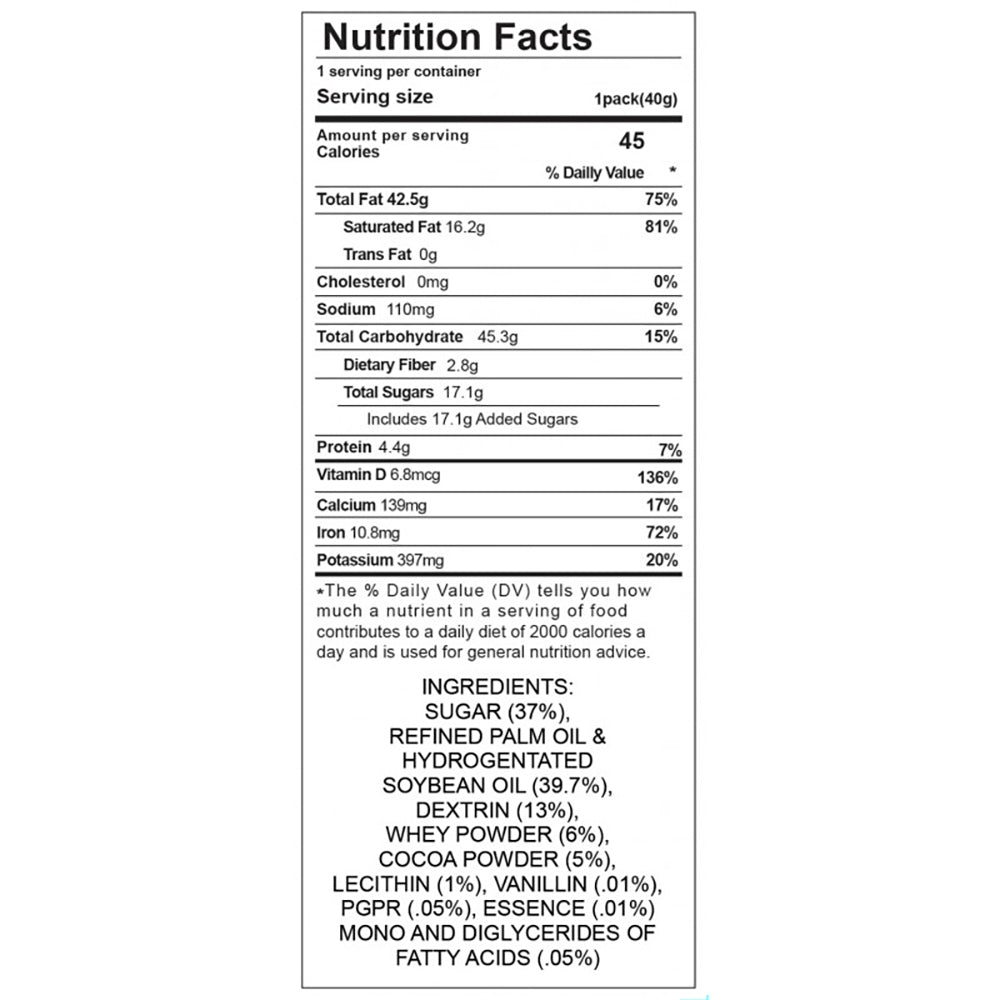 Sugar (37%) Refined Palm Oil & Hydrogenated Soybean Oil (39.7%) Dextrin (13%) Whey Powder (6%) Cocoa Powder (5%) Lecithin (1%) Vanillin (.01%) PGPR (.05%) Essence (.01%) Mono and Diglycerides of Fatty Acids (.05%)