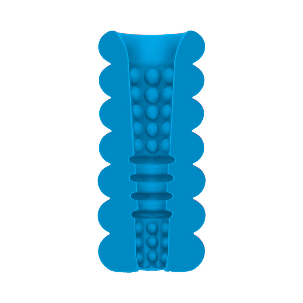 Triple your fun with Mood Thrill. Made of the lifelike UR3 material this handheld stroker features three internal textures for versatile stimulation. The unique triple-texture pleasure tunnel includes large massage beads at the entry thick ribbing in the middle and stimulating beads tapering to a tight finish at the open-end. Easy to clean. It even warms to the touch. Total length 4.5 in. width 1.8 in.