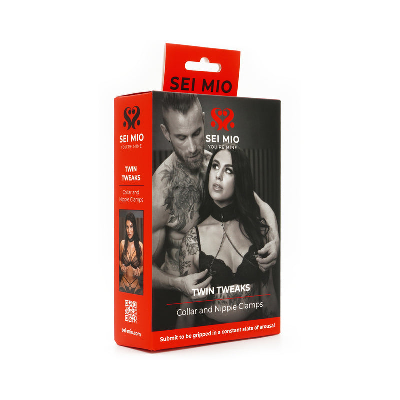 Indulge in the perfect blend of elegance and excitement with the Sei Mio Twin Tweaks Collar and Nipple Clamps set. This beautifully crafted collar made from velvet-soft faux leather rests comfortably around the neck while setting the stage for playful restraint.