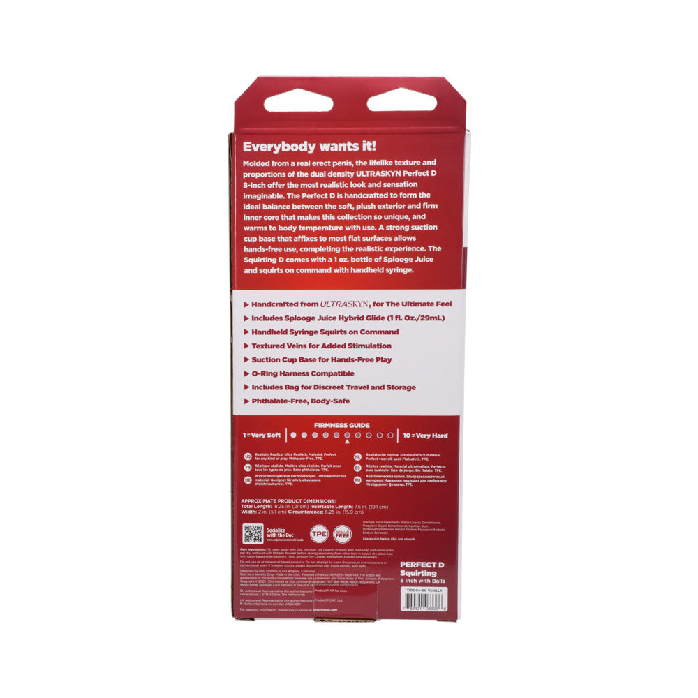 Everybody wants it! Molded from a real erect penis the lifelike texture and proportions of the dual-density ULTRASKYN Perfect D 8-Inch offer the most realistic look and sensation imaginable. The Perfect D is handcrafted to form the ideal balance between the soft plush exterior and firm inner core that makes this collection so unique and warms to body temperature with use. A strong suction cup base that affixes to most flat surfaces allows hands-free use completing the realistic experience. The Squirting D comes with a 1 oz. bottle of Splooge Juice and squirts on command with handheld syringe.- Handcrafted from ULTRASKYN for The Ultimate Feel